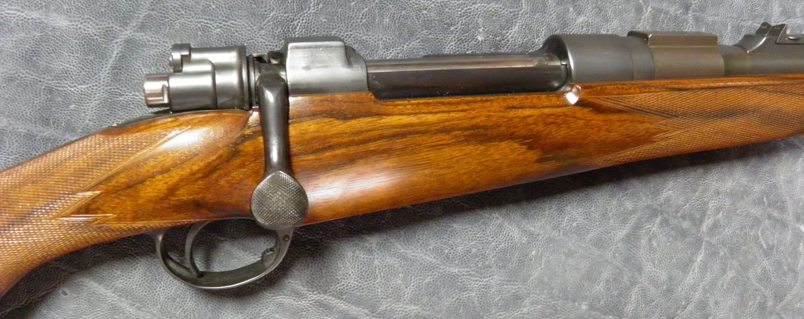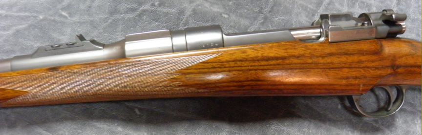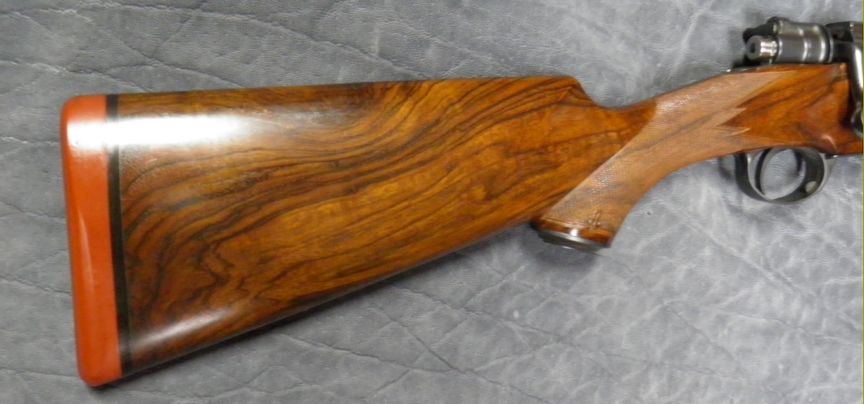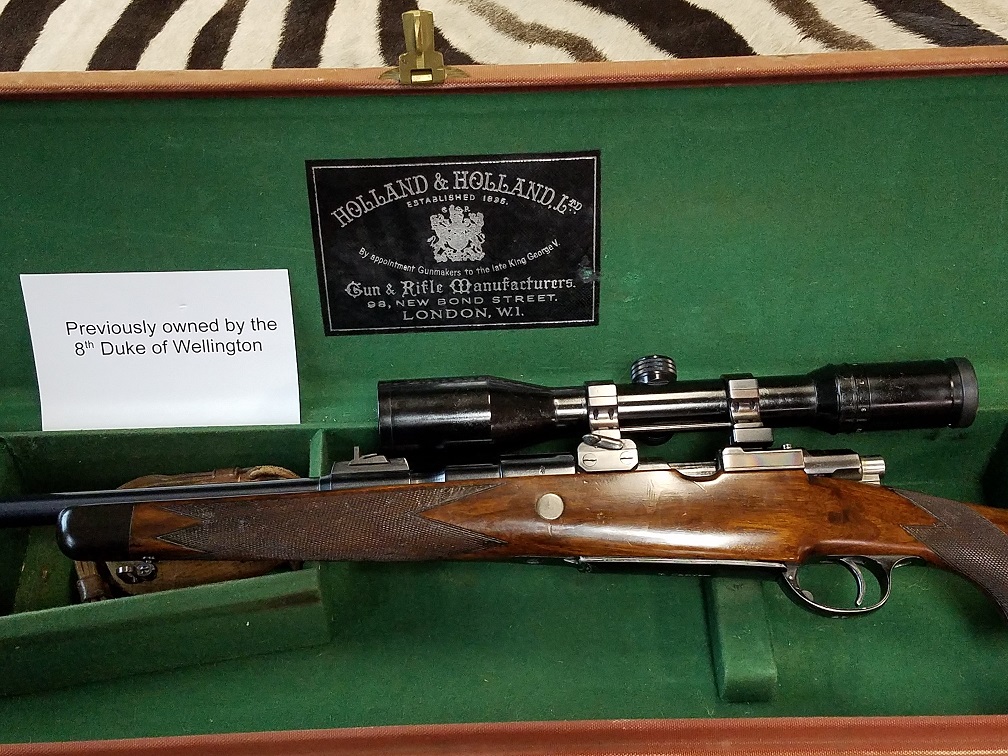 HOLLAND & HOLLAND 300 H&H BEST QUALITY BOLT ACTION RIFLE. MADE IN 1956 FOR THE DUKE OF WELLINGTON. IT WAS CONVERTED IN 1991 FROM .244 TO .300 BY HOLLAND & HOLLAND FOR THE DUKE. IT HAS AN H&H HARDCASE WITH THE CARTUCHE STAMPED WITH A "W" ON TOP. THE STOCK ALSO HAS A CROWN AND "W" INLAYED. THE RIFLE COMES WITH TWO SCOPES WITH H&H MOUNT AND RINGS. ONE SCOPE IS ORIGINAL B NICKEL SUPRA 4X36 WITH RINGS ENGRAVED WITH H&H ON TOP. THE SECOND SCOPE IS A KAHLES 2.2X9 WITH H&H RINGS. THE RIFLE HAS A 24 3/4" BARREL WITH A BLOCK MOUNTED BEAD FORESIGHT AND FOLD OVER HOOD. THE LENGTH OF PULL IS 13 3/4". THIS IS A GREAT OLD RIFLE IN THE ORIGINAL CASE WITH PAPERWORK FROM H&H AND SOME HISTORY ON THE DUKE. | $19,900.00 |