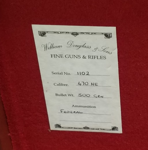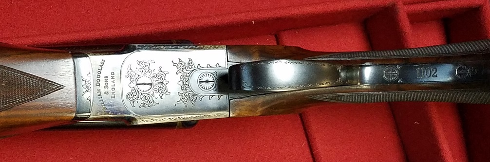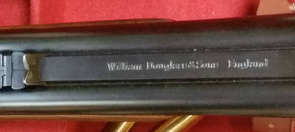 WILLIAM DOUGLASS & SONS .470 NITRO EXPRESS BOXLOCK EJECTOR DOUBLE RIFLE. THE 23.5" BARRELS HAVE FLIP UP MOON FRONT SIGHT AND THREE LEAF ( ONE STANDING AND TWO FOLDING) REAR EXPRESS SIGHTS, RAISED QUARTER RIB MARKED WILLIAM DOUGLASS & SONS ENGLAND, STANDARD LONDON PROOFS ON THE FLATS DATED 1996.FINE ENGLISH STYLE SCROLL ENGRAVING WITH STANDARD MAKERS MARKS AND PROOFS. HAS DOUBLE TRIGGERS AND MANUAL SLIDING TANG SAFETY WITH GOLD INLAY "SAFE". CHECKERED BEAVERTAIL FOREARM WITH ENGRAVED FITTINGS AND NICELY FIGURED STOCK.DROP AT COMB 1 3/8", DROP AT HEEL 2 1/4", LOP 14 3/4", 9 LBS. 15 OZ. COMES WITH WILLIAM DOUGLASS & SONS BRASS CORNERED LEATHER CASE WITH TOOLS. | $12.900.00 |